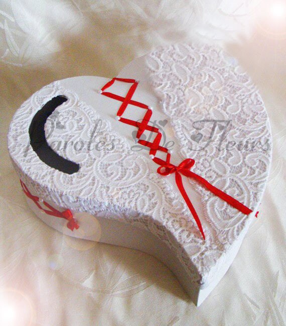 Carte blanche, cœur rouge, oiseaux blancs et fleurs blanches au ruban d'organza blanc. Sobre, vous pouvez l'utiliser telle quelle, ou alors l'habiller et la décorer à votre guise pour l'adapter à votre thème de mariage. Elle joue le rôle de tirelire, et permet aux invités d'y déposer leurs dons pour la cagnotte ou la lune de miel des mariés. Urne de mariage coeur rouge et blanche.