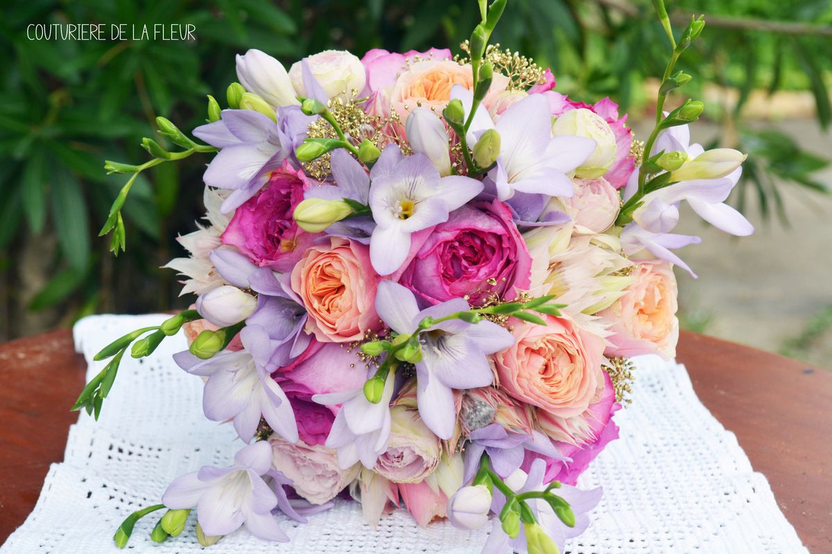 Le bouquet de mariée en cascade ? La tradition du lancé du bouquet mariée est née en france au 15 siècles. Coloré aux motifs liberty, il convient parfaitement pour un mariage bohème, champêtre et pétillant.
